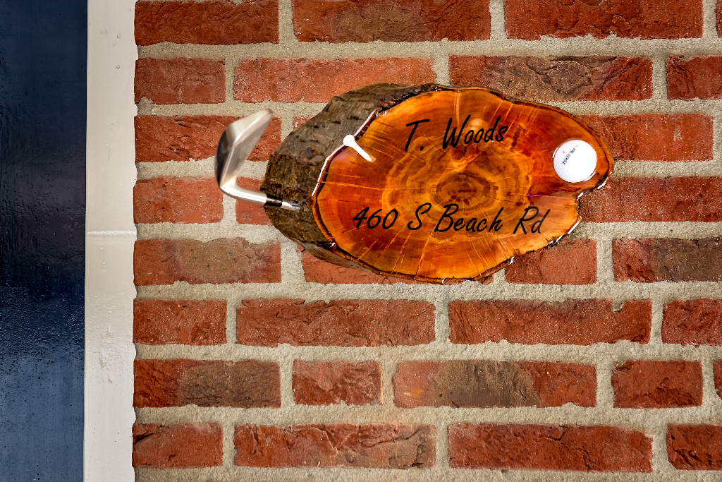 Geglazuurde houten stam. Opvallend afgewerkt met clubhoofd, golfbal en tees. Uiteraard voor u op maat gemaakt.